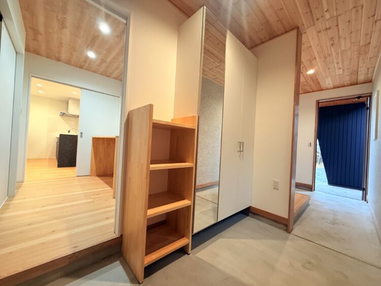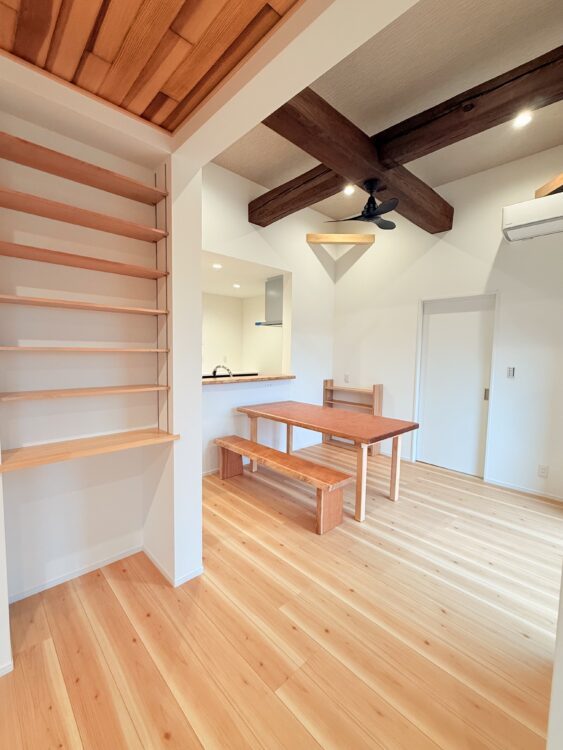 お客様のご先祖様が大正時代に建てられ、新築に伴い解体した建物の材料を化粧梁に使わせていただきました。