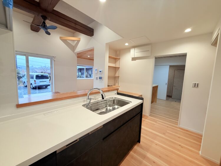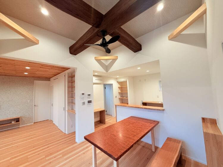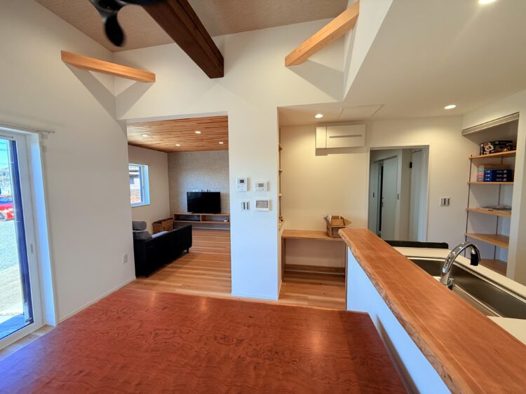 手作り家具:フロートTVボード・ダイニングテーブル、ベンチ・キッチン背面カウンター・脱衣室ワーキングカウンター、造り付け棚などはいつものように大工の手作りです。