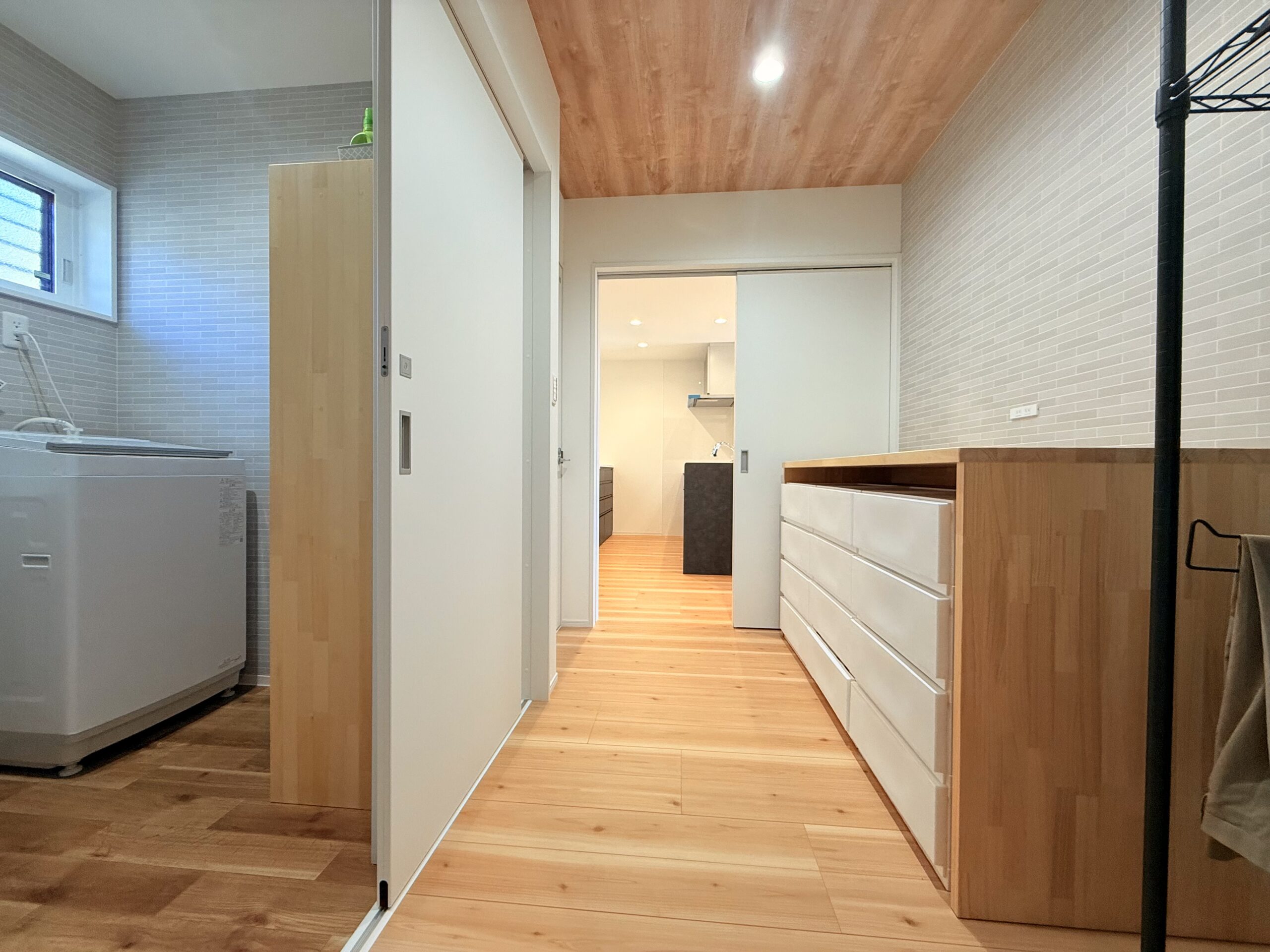 手作り家具:フロートTVボード・ダイニングテーブル、ベンチ・キッチン背面カウンター・脱衣室ワーキングカウンター、造り付け棚などはいつものように大工の手作りです。